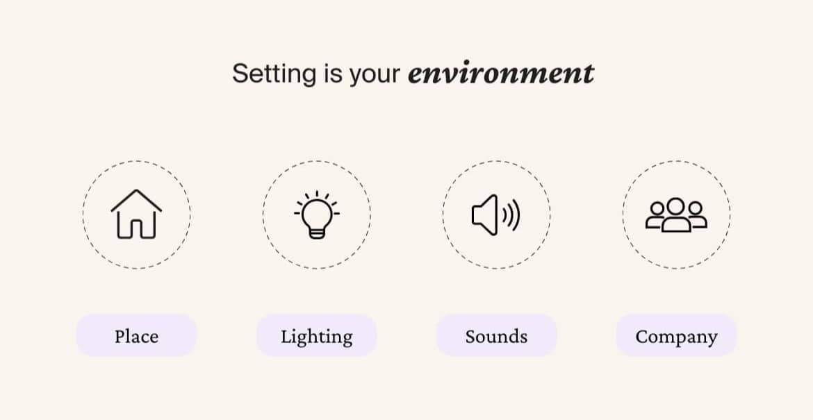 Setting refers to your environment—space, lighting, smells, sounds, people, and overall ambiance.