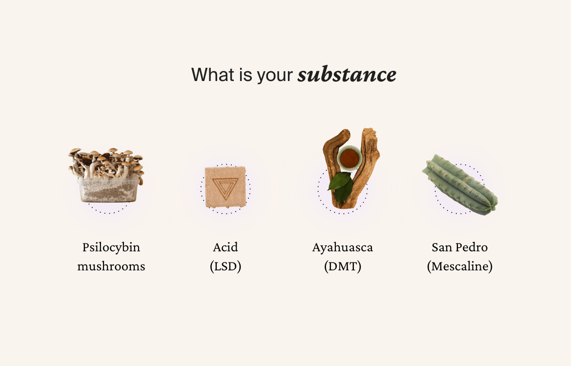 Substance. The psychedelic you’re taking—its dosage, effects, duration, risks, and contraindications.