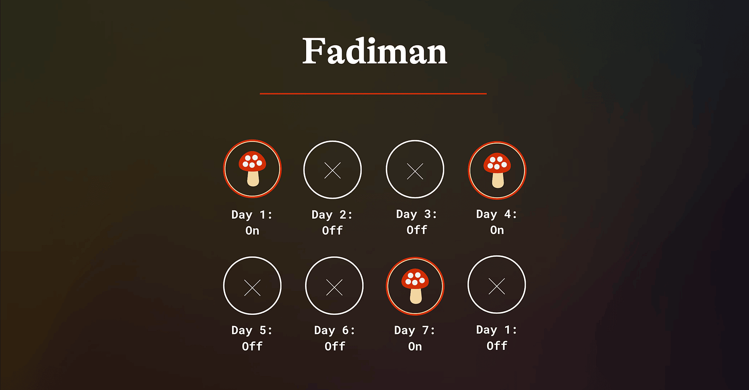 Fadiman: 1️⃣ day on, 2️⃣ days off. Repeat.